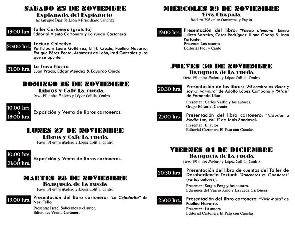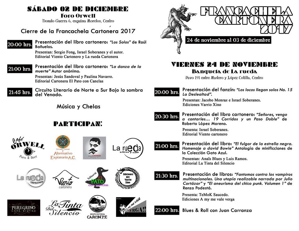 18 noviembre, 201718 noviembre, 2019 por cafeorwellgdl Francachela Cartonera Séptima Edición 2 de diciembre cierre en Café Orwell Compártelo: Haz clic para compartir en X (Se abre en una ventana nueva) X Haz clic para compartir en Facebook (Se abre en una ventana nueva) Facebook Me gusta Cargando... Relacionado
